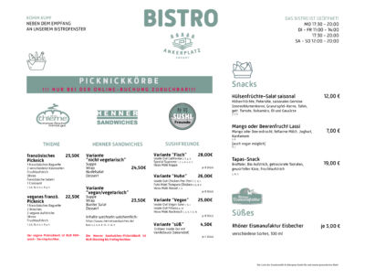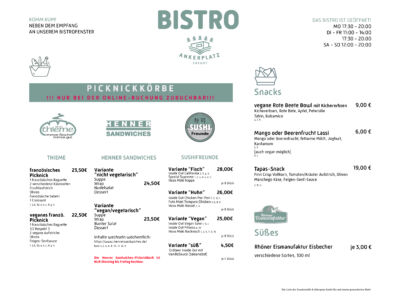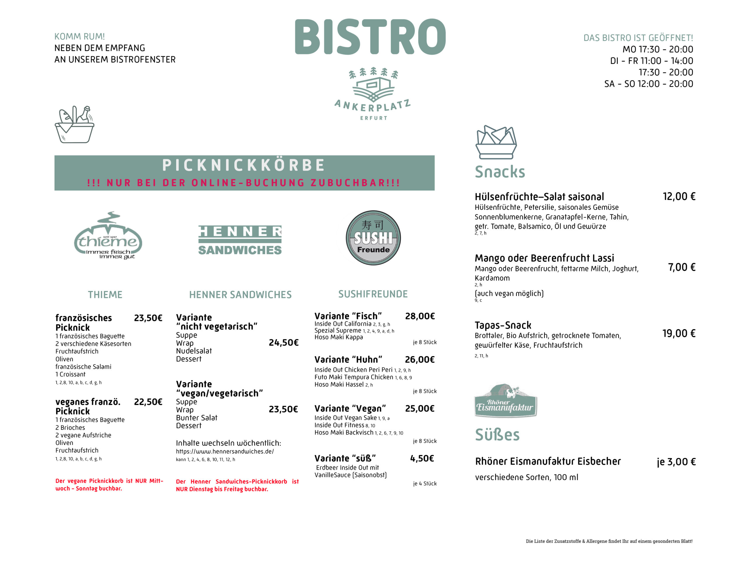 Diese drei Partner sind Sushifreunde Erfurt, das Henners aus Erfurt und neu die Bäckerei Thieme. Mit allen Partnern haben wir neue Picknickkörbe abgestimmt und können Euch folgendes Angebot zur Verfügung stellen: